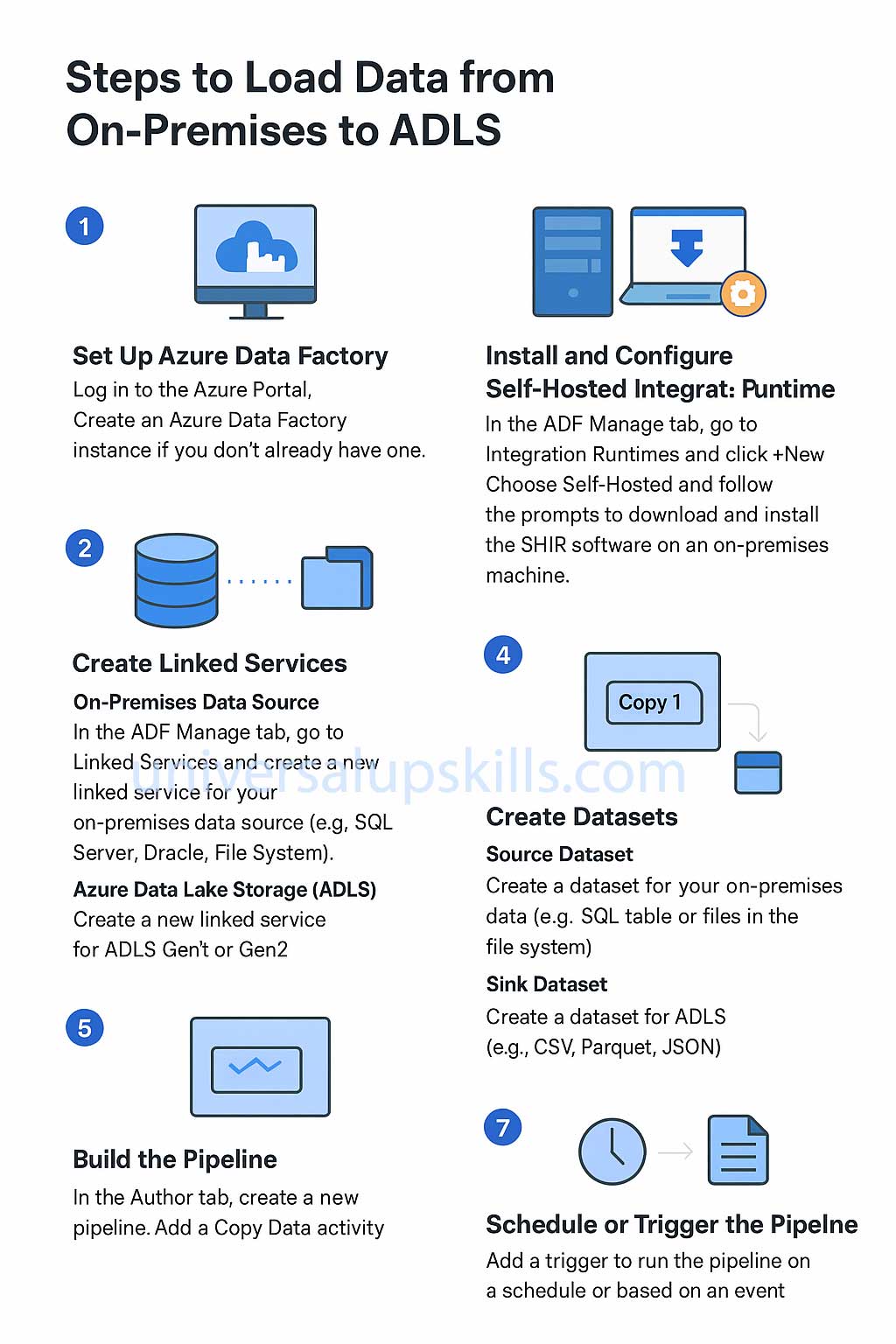 Loading data from an on-premises data source to Azure Data Lake Storage (ADLS) using Azure Data Factory (ADF) involves the following steps. The key component for connecting on-premises data sources is the Self-Hosted Integration Runtime (SHIR).